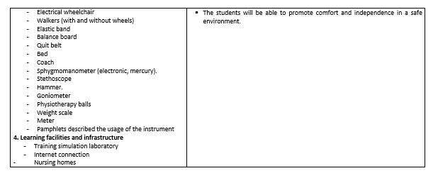 •• At the end of this module, students will be able to:1. Maintain the improvement of muscle strength and how to use them effectively.2. Preserve the physiological needs of the elderly.3. Ensure the use of safety measures in the surrounding environment.4. Accomplish the satisfaction of emotional needs. -