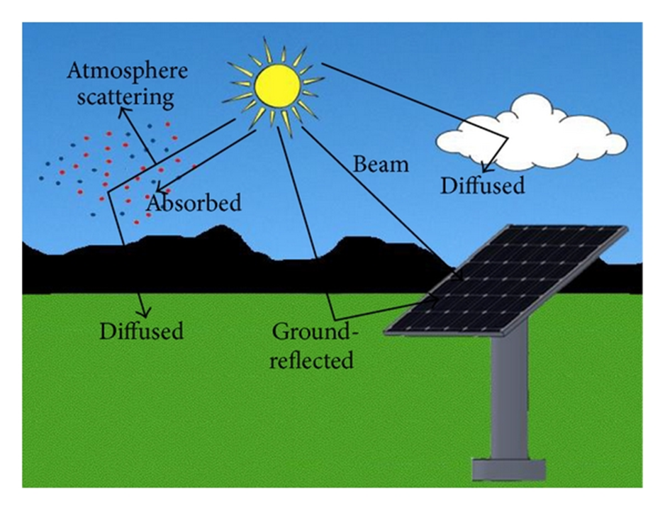 The global solar radiation incident on a tilted surface (G_T) is composed of three components, including beam radiation, diffuse radiation and radiation reflected from various surfaces facing the tilted surface..