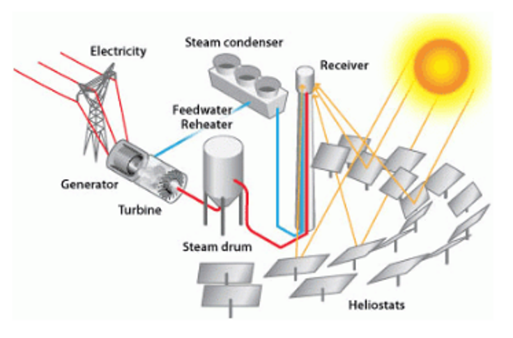 Concentrating Solar Power (CSP)systems generate electricity by using mirrors or lenses to concentrate a large area of sunlight, or solar thermal energy, onto a small area. This concentrated solar energy is then used to heat a fluid, which drives a heat engine (such as a steam turbine) to generate electricity. CSP systems are distinct from photovoltaic (PV) solar systems, which convert sunlight directly into electricity using semiconductor materials.