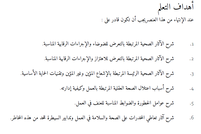 يهدف هذا المساق الى تعريف الطلبة في الكليات الجامعية والمتوسطة بأهم المعارف النظرية والمهارات العملية وكذلك المواقفية المرتبطة بالسلامة والصحة المهنية